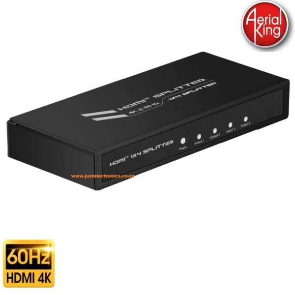 This Aerial King 4-Port 4K HDMI splitter connects your HDMI video source to four HDMI displays at the same time, without distorting or degrading your video signal. For dependable performance, the splitter features a durable metal housing that provides passive cooling. True 4K at 60Hz and HDR With transmission bandwidth up to 18Gbps, this HDMI splitter is fully compatible with your HDMI 2. 0 equipment, supporting UHD resolutions up to 4096×2160 (4K) at 60Hz.  Easy Installation For hassle-free setup, the 1×4 HDMI splitter offers easy plug-and-play installation