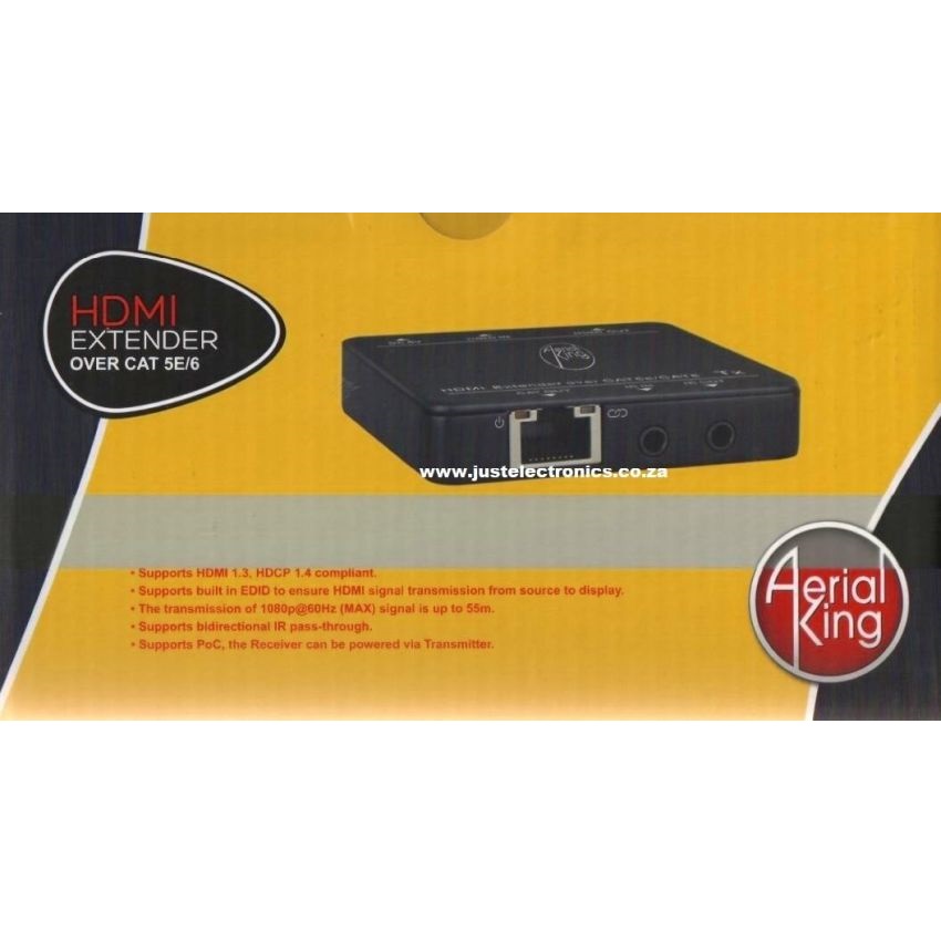 The Aerial King HDMI extender extends HDMI signal between transmitter and receiver ovet cat5e/6 cable. It supports 1080p@60Hz video signals up to 55m including embedded multi-channel audio and HDCP 1.4