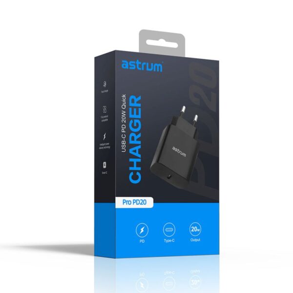 The Astrum USB-C 20W Quick Wall Charger delivers rapid, efficient charging at the home, office, and on the go. Efficient charging speeds delivering 20W 3A PD (power delivery)