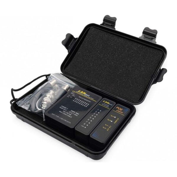 The PoE tester shows you whether a PoE signal is present at a port or network socket and which PoE mode is involved: the PoE finder is compatible with PoE standards 802.3af & 802.3at. The testing device is suitable for all network cables, from CAT3 & Coax BNC to CAT5, CAT6 and CAT7 as well as UAE, TAE and telephone cables (useful during cable installation for your DSL connection for example).