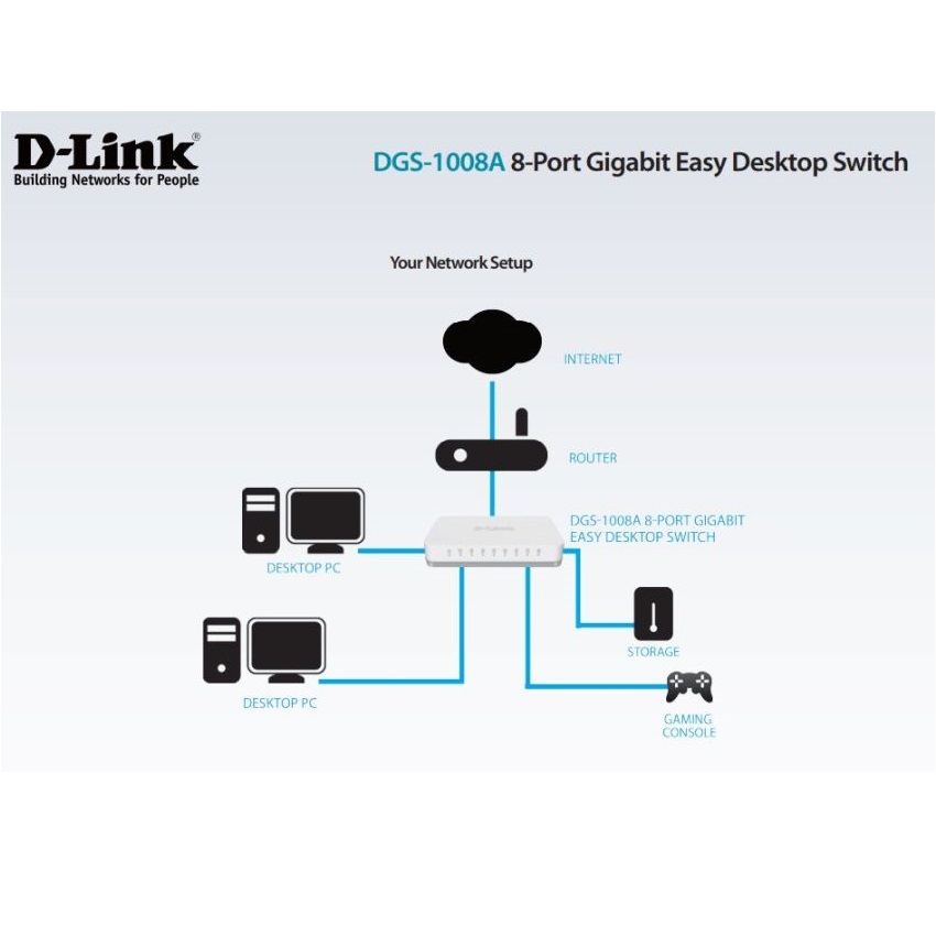 Light, Compact Design Fits Into Any Decor.  D-Link 8 Port Gigabit Switch (DGS-1008A)