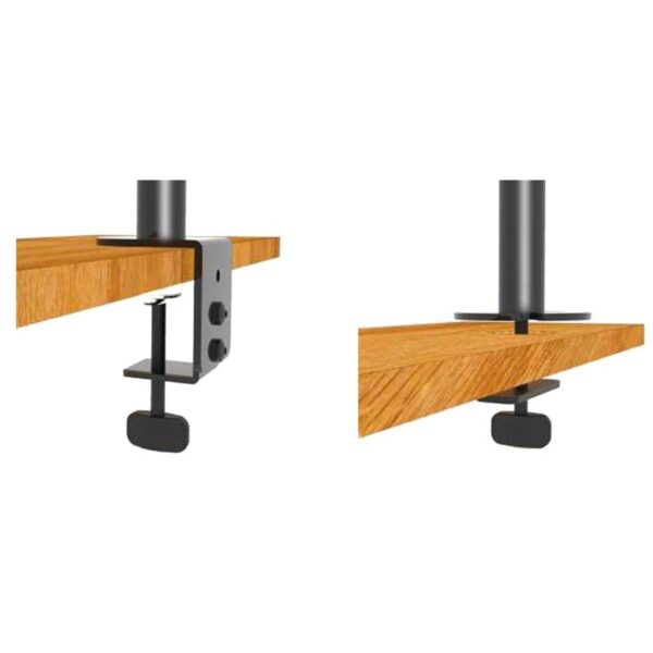 The desk clamp mounts to the back of your desk with a heavy duty C-clamp or optional grommet mount. The clamp works with a desk thickness of 10mm to 78mm. The Vesa mounting plate can tilt +60 deg to -60 deg, the arm can swivel 180 deg with 360 deg.rotation and height adjustment along the pole.