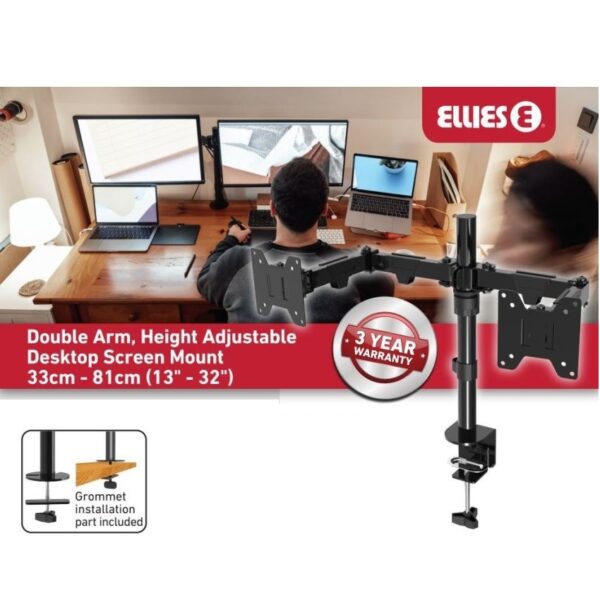 Ellies Double Arm Height Adjustable Desktop Screen Mount 13″ – 32″