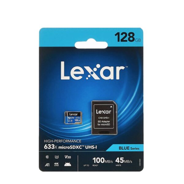 Designed for your smartphone, tablet, or action camera, Lexar High-Performance 633x microSDXC UHS-I cards BLUE Series let you quickly capture, playback, and transfer 1080p Full-HD, 3D, and 4K UHD video, as well as the highest-quality movies, photos, and songs. These high-capacity, Class 10 cards leverage UHS-I technology to deliver high-speed performance up to 100MB/s. This premium memory card includes an SD adapter and provides the speed and space you need to capture more adventure on the go.