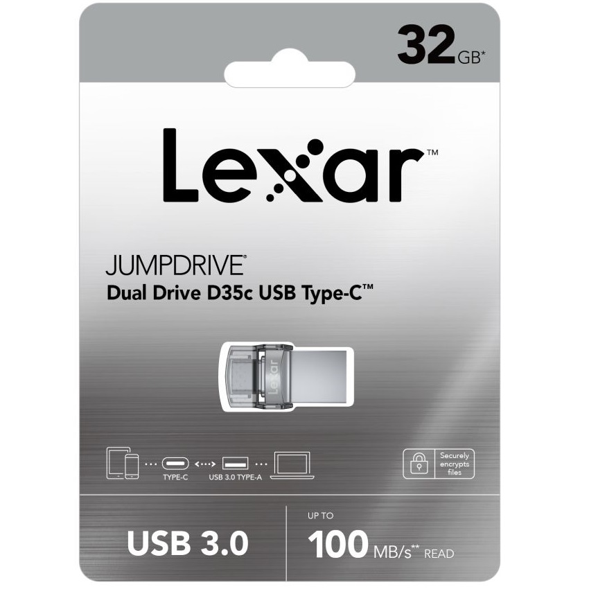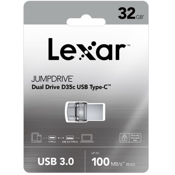 With the Lexar JumpDrive Dual Drive D35c USB 3.0 Type-C, you can seamlessly move files between USB Type-C smartphones, tablets, computers, and Type-A devices with ease. This 2-in-1 drive features both USB Type-C and standard USB Type-A connectors in a compact design. It provides high-speed performance for fast file transfer, with speeds up to 100MB/s read. It’s a great way to expand your storage for your devices, as well as offloading content from them, so there’s room for more of your favorite photos and videos.