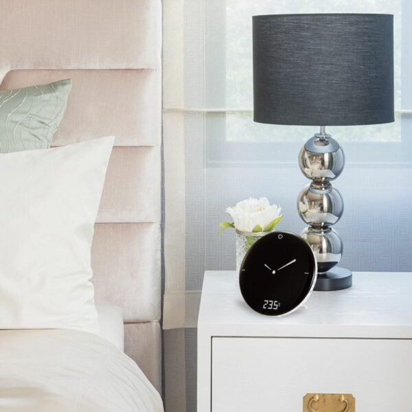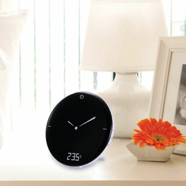 A complete alarm clock mixing digital functionality with analog display. With the large 10.5cm diameter, the easy-to-read LCD display will show the date, time and the indoor temperature at a glance.