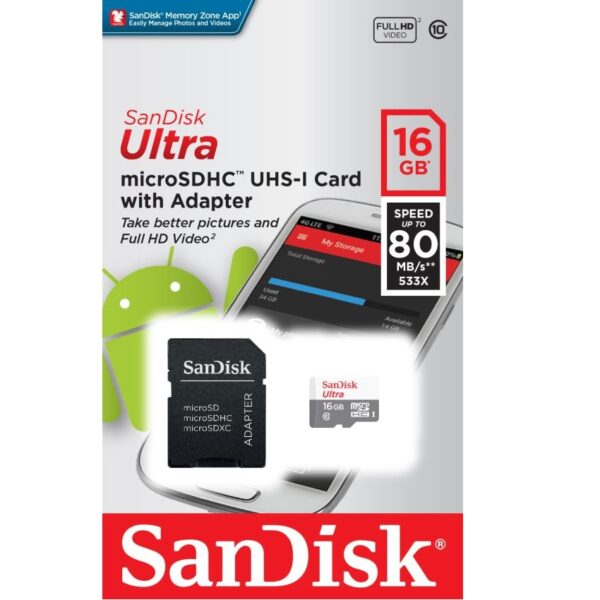 Thanks to its Class 10 rating, the SanDisk Ultra microSDHC UHS-I Card allows you to capture and play back Full HD video without dropouts or stuttering. The card adds up to 16GB of space to your Android smartphone or tablet, so you can store plenty of Full HD video before you have to transfer files to your computer.