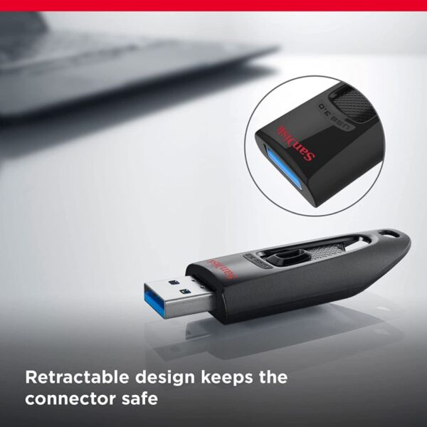 With its sleek black design, the SanDisk Ultra USB 3.0 Flash Drive is as stylish as it is practical. This compact and portable drive can easily travel with you in a pocket or handbag.