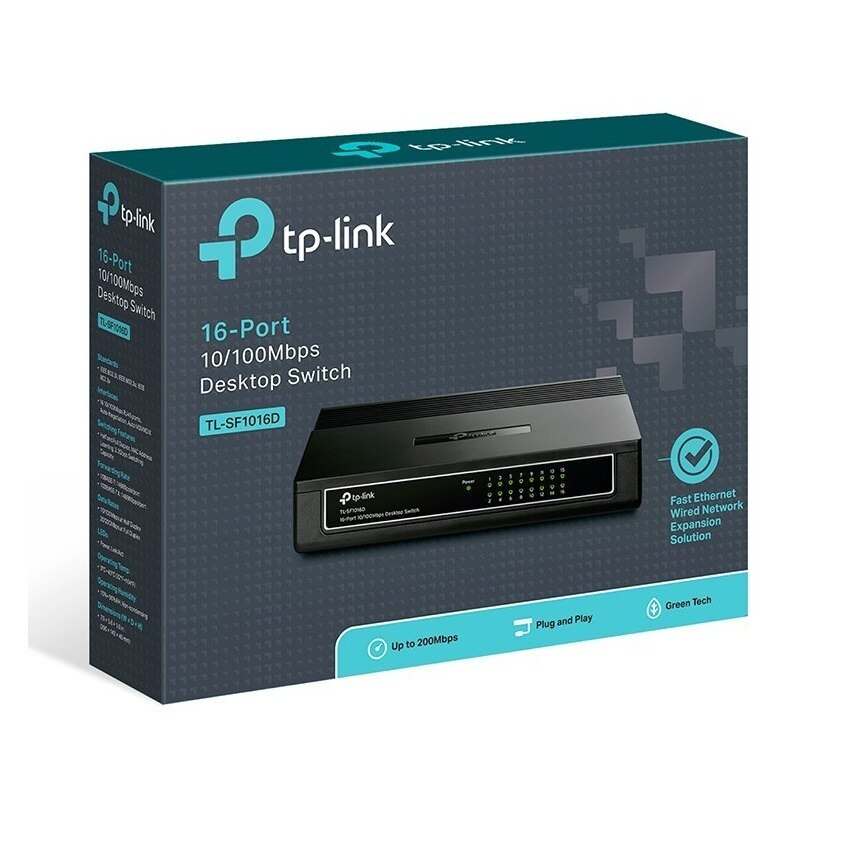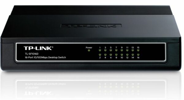 TP-Link TL-SF1016D Fast Ethernet Switch provides 16 10/100Mbps Auto-Negotiation RJ45 ports. All ports support Auto MDI/MDIX function, eliminating the need for crossover cables or Uplink ports. Featuring non-blocking switching architecture, TL-SF1016D forwards and filters packets at full wire-speed for maximum throughput. And IEEE 802.3x flow control for Full Duplex mode and backpressure for Half Duplex mode alleviate the traffic congestion and make TL-SF1016D work reliably.