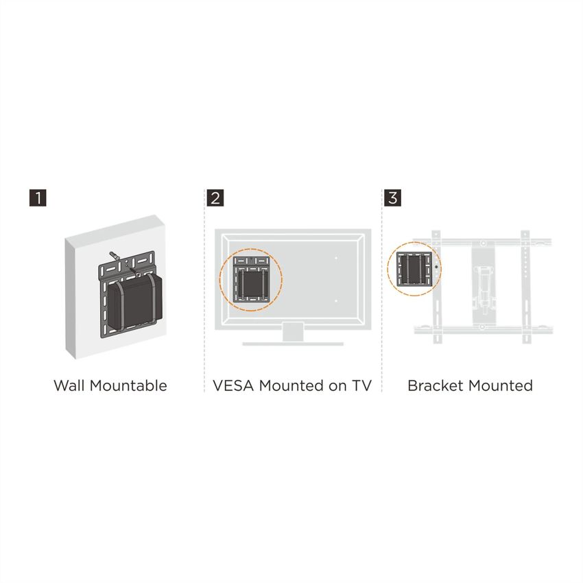 - Three installation options: wall mount, VESA mount on TV, or mount to most TV brackets.