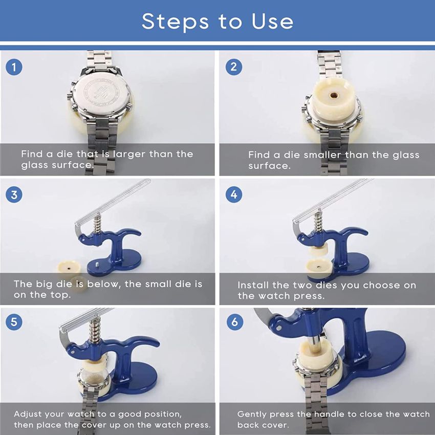 This crystal press case closer combination is one of the best presses on the market. It is made of metal and is very sturdy. The press comes with 12 nylon dies, both tapered and flat for fitting flat mineral glasses and backs for quartz watch cases with ease. The handle works smoothly, giving you total control over the force exerted during operation. The press operates on a face down configuration allowing you to monitor the closing process the entire time.