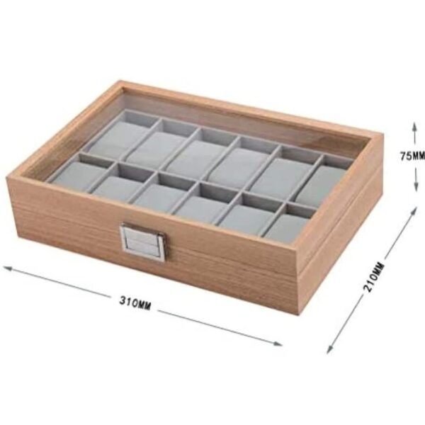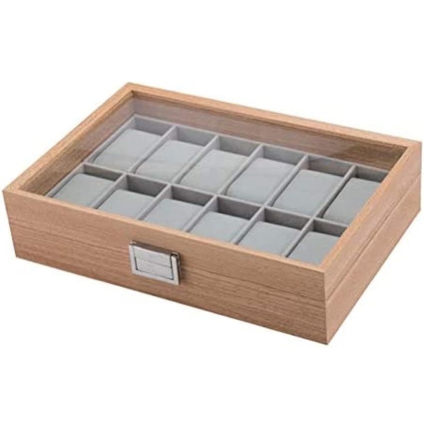The wooden watch box display case organizer 12 slot in a bamboo-style finish with clear display lid and grey lining is designed for the serious collector who regards his timepieces as assets, not ornaments. With its clean, modern lines and elevated materials, it provides a refined way to protect, organise and showcase an extended collection of quality watches.