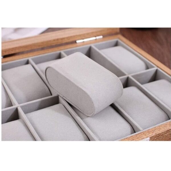 - Twelve individual slots with plush grey cushions for secure watch protection